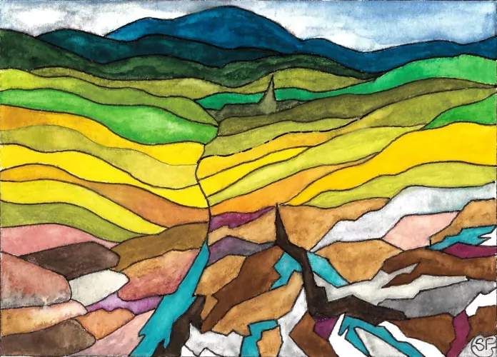Silvae Frémont, notre amie et artiste peintre, a ainsi imaginé notre amphithéâtre naturel, où les vignes chatoyantes et la forêt ondoyante dominent le village posé au pied de l’Ungersberg.